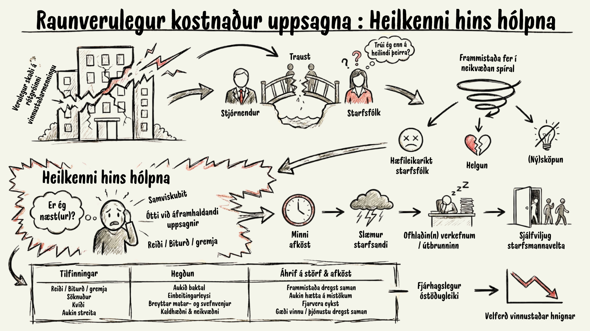 Uppsagnir búa til ósýnilegar undiröldur sem fara um allan vinnustaðinn og áhrifin sjást í framleiðni, fjarveru, samvinnu, starfsánægju og trausti.